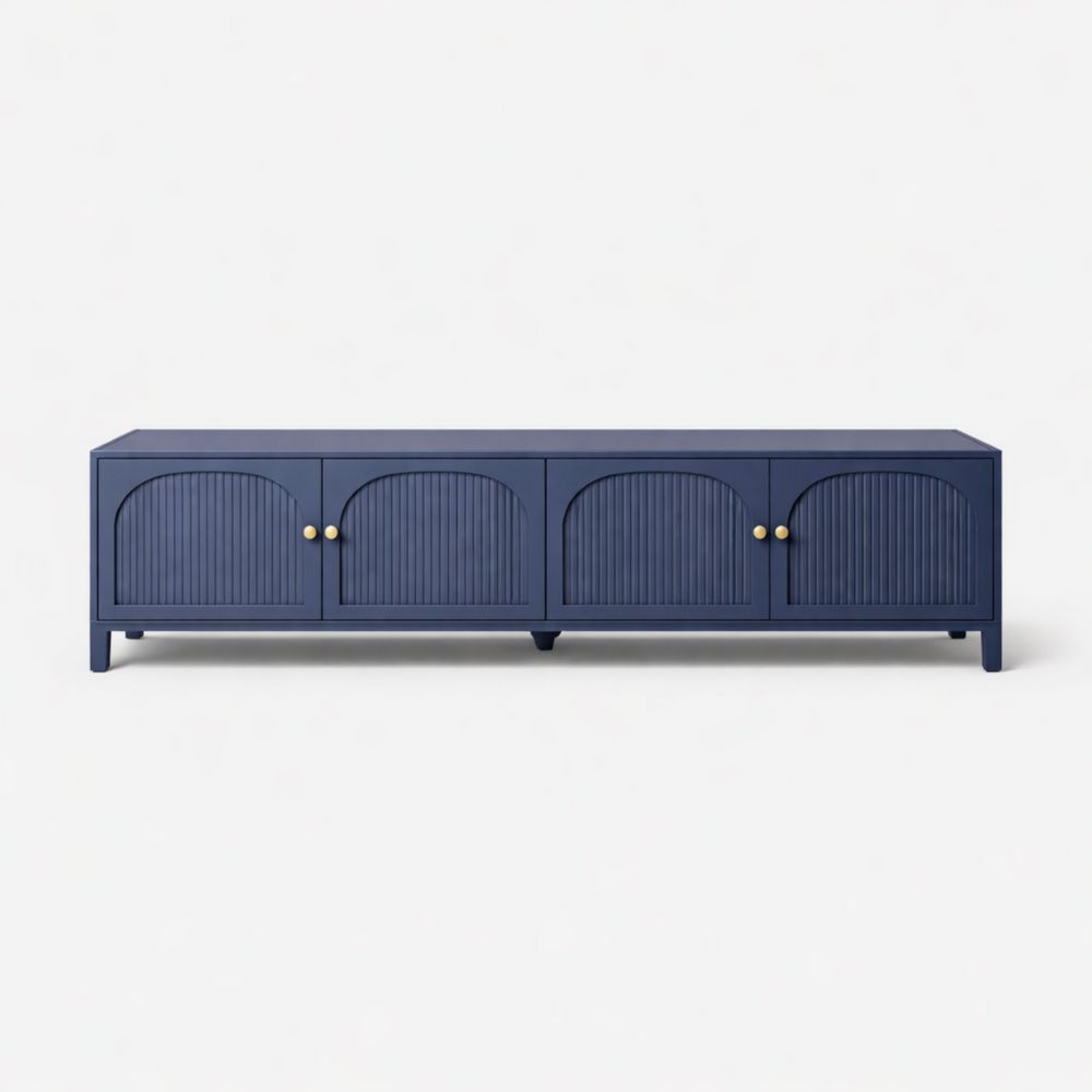 Navy Blue Wooden TV Stand with Ribbed Doors and Gold Accents
