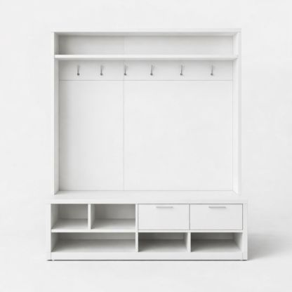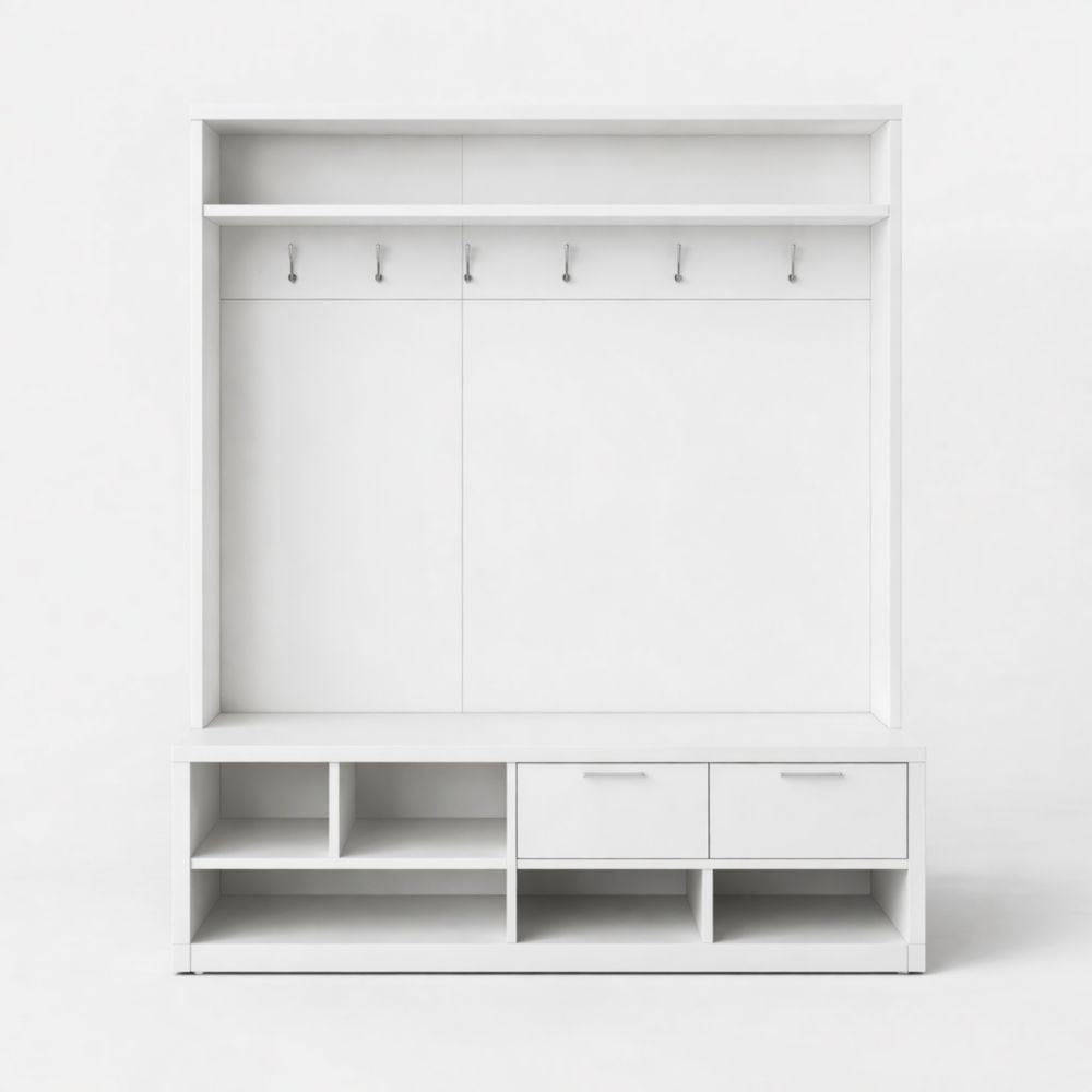 Wood Wall-Mounted White Entryway Organizer with Metal Hooks and Drawers