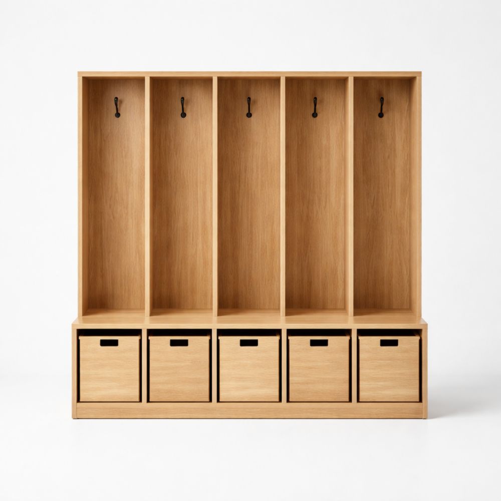 Wooden coat rack unit with five compartments and a storage box
