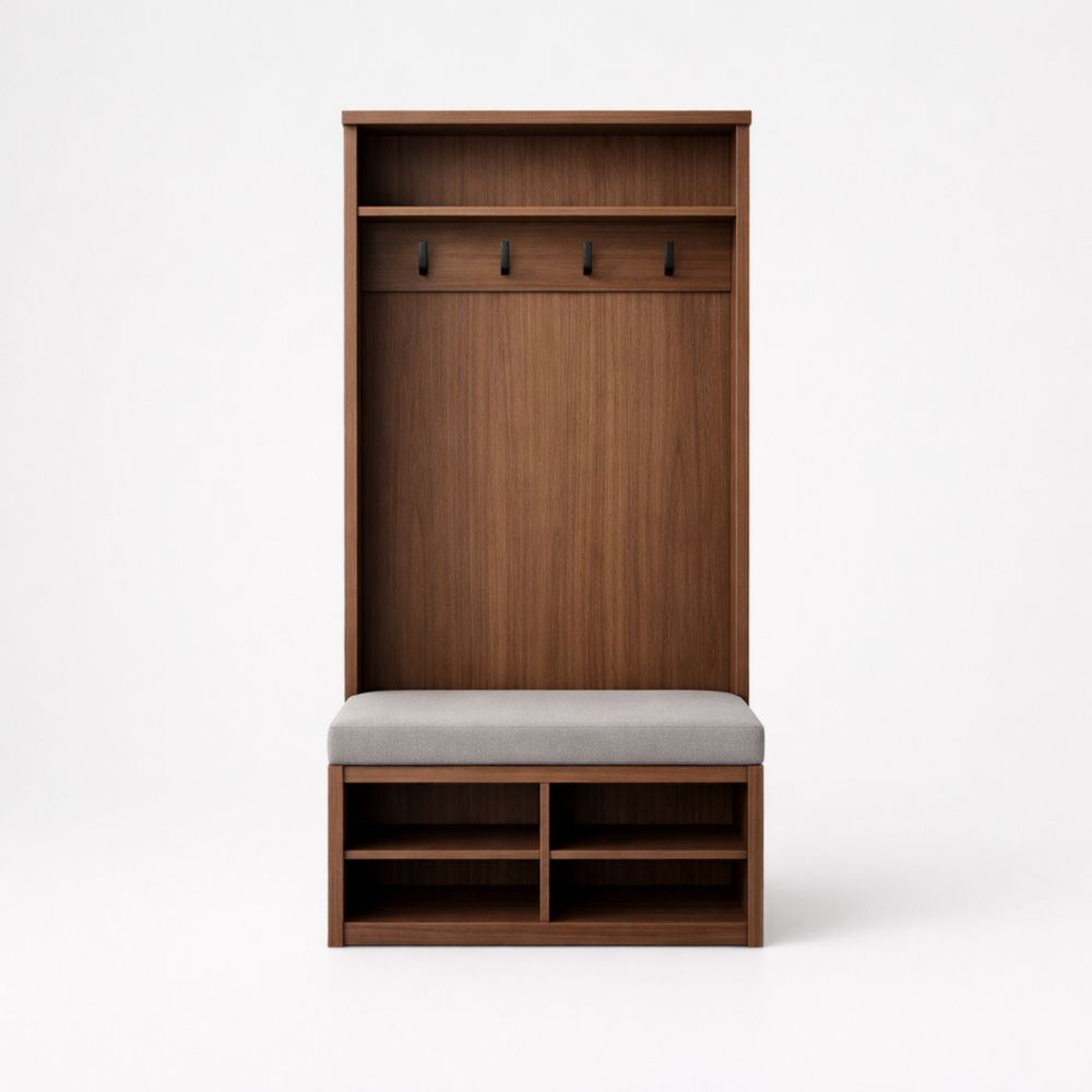 Wooden coat rack with shoe bench and hooks, 180 cm, brown and gray